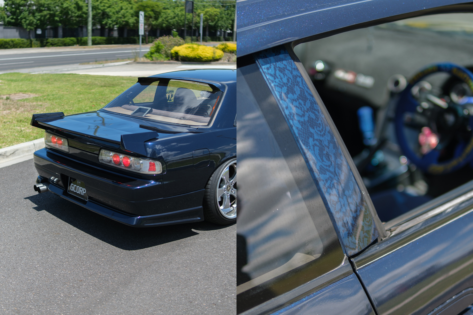 The S13 is styled so uniquely, breaking away from the typical approach many follow. On the exterior, the car sits on a set of chrome ABC Exclusive wheels and features a full G-Corporation aero kit, a fiberglass URAS drag wing, aero mirrors, and some really cool clear tail lights that perfectly capture the old-school JDM/USDM crossover style from the 2000s. It’s finished in a metallic blue paint.