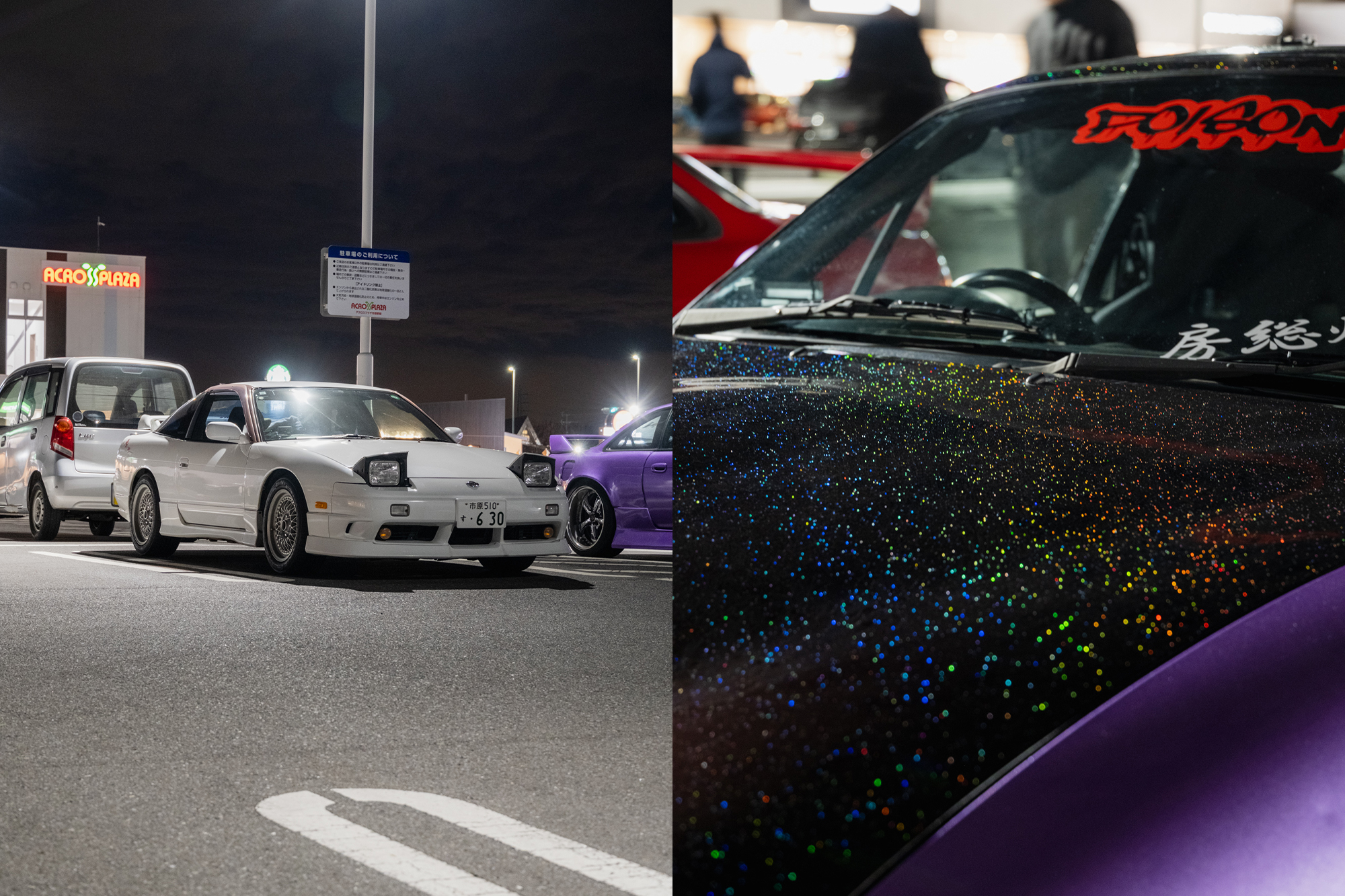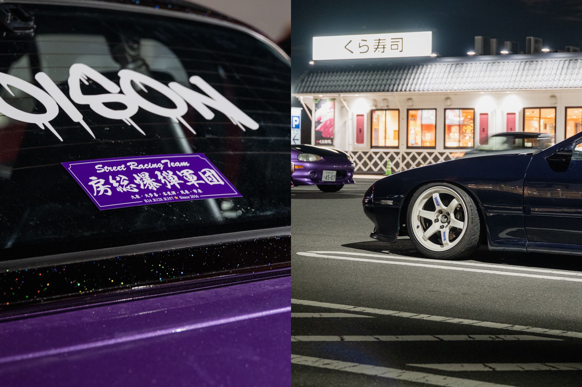 It’s a Thursday night in Japan, and my good friend @sotobo_oldschool tells me he’s arranged a small meet with some of his close friends: Team Poison, a famous drift team predominantly from Chiba, known for their matching purple cars. The team is led by @tsuba_s13, who drives a purple C33 powered by an SR20 (which was actually a cover car for Drift Tengoku magazine!). I’d met Tsuba before, but it was great to see him again thanks to @sotobo_oldschool.