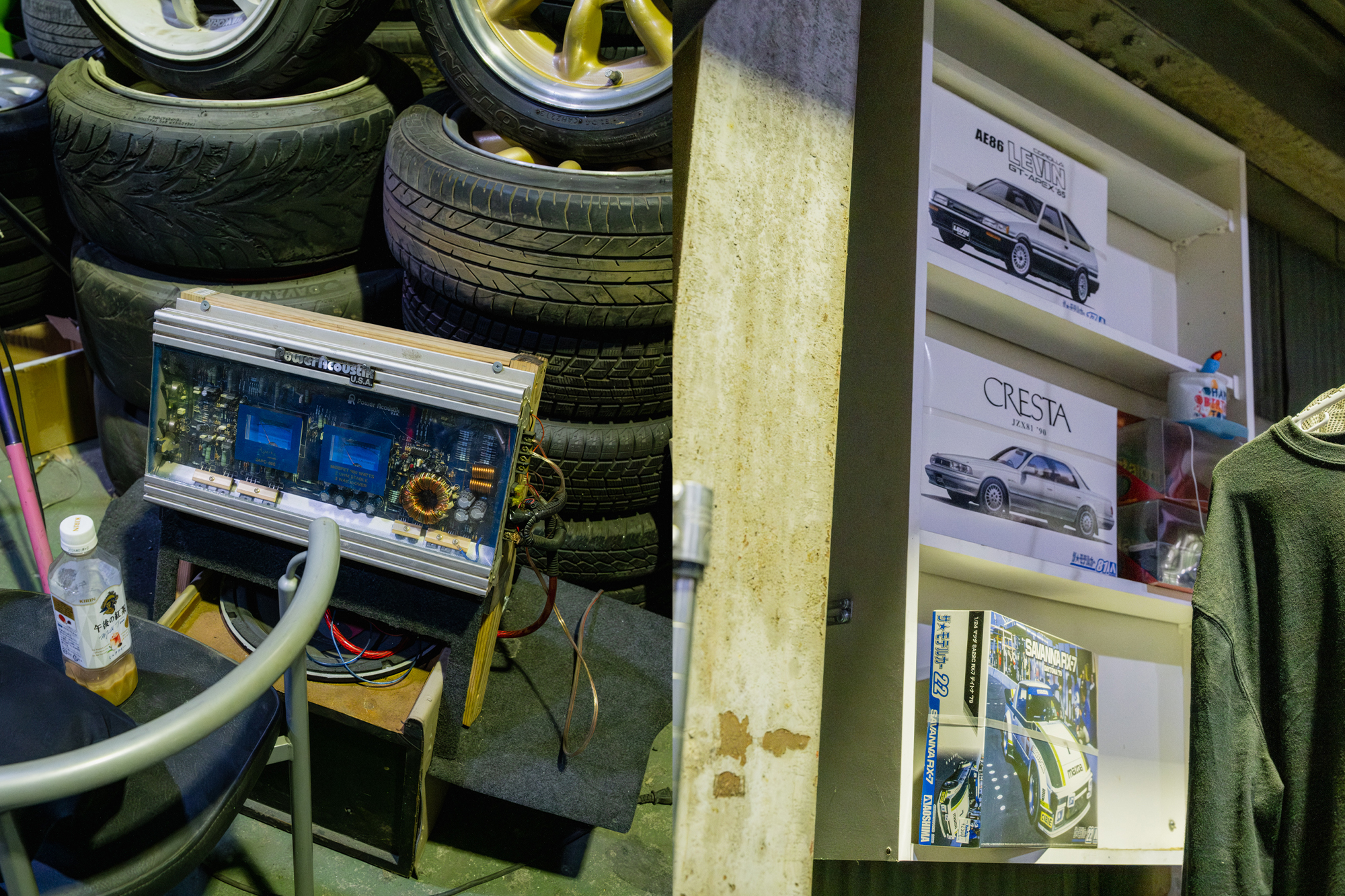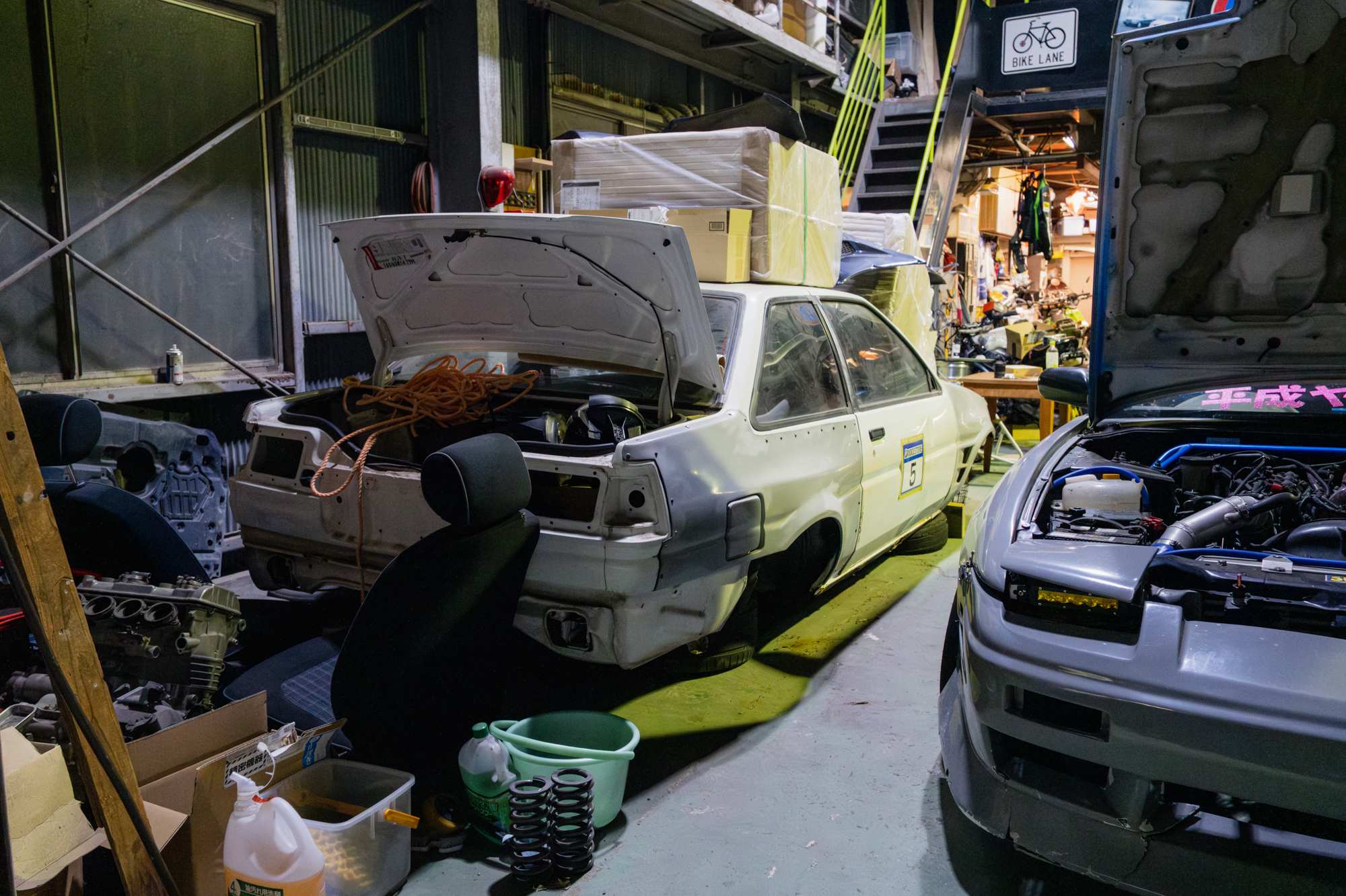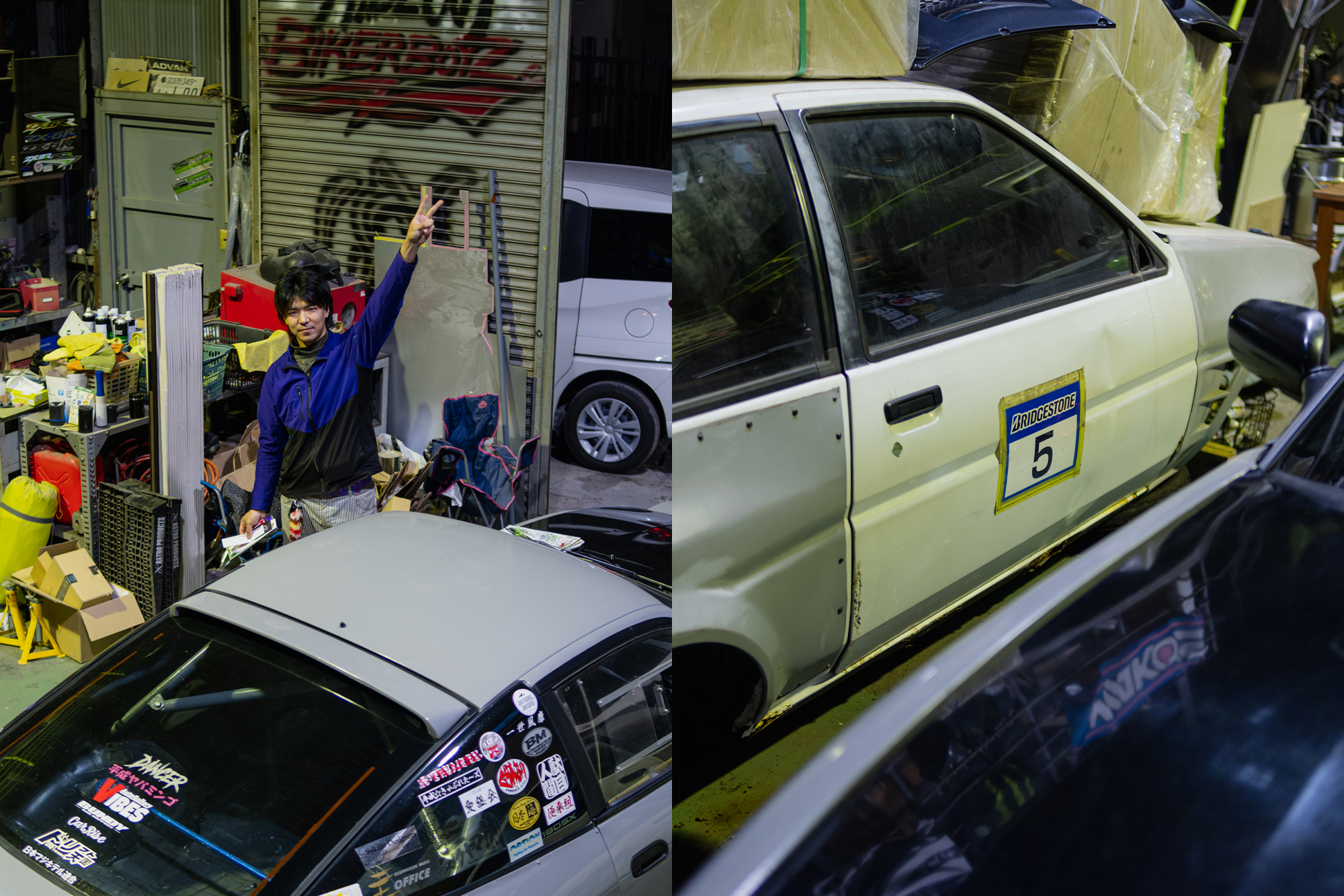 At the end of the laneway, we arrive at the workshop. It’s called “Various Quality R’s,” and it’s run by a guy named Rikiya, a well-known drifter in Tokyo. He’s best known for his green AE86, powered by a naturally aspirated rotary engine, though that car wasn’t at the shop that night. Instead, his grey 180SX was parked inside.