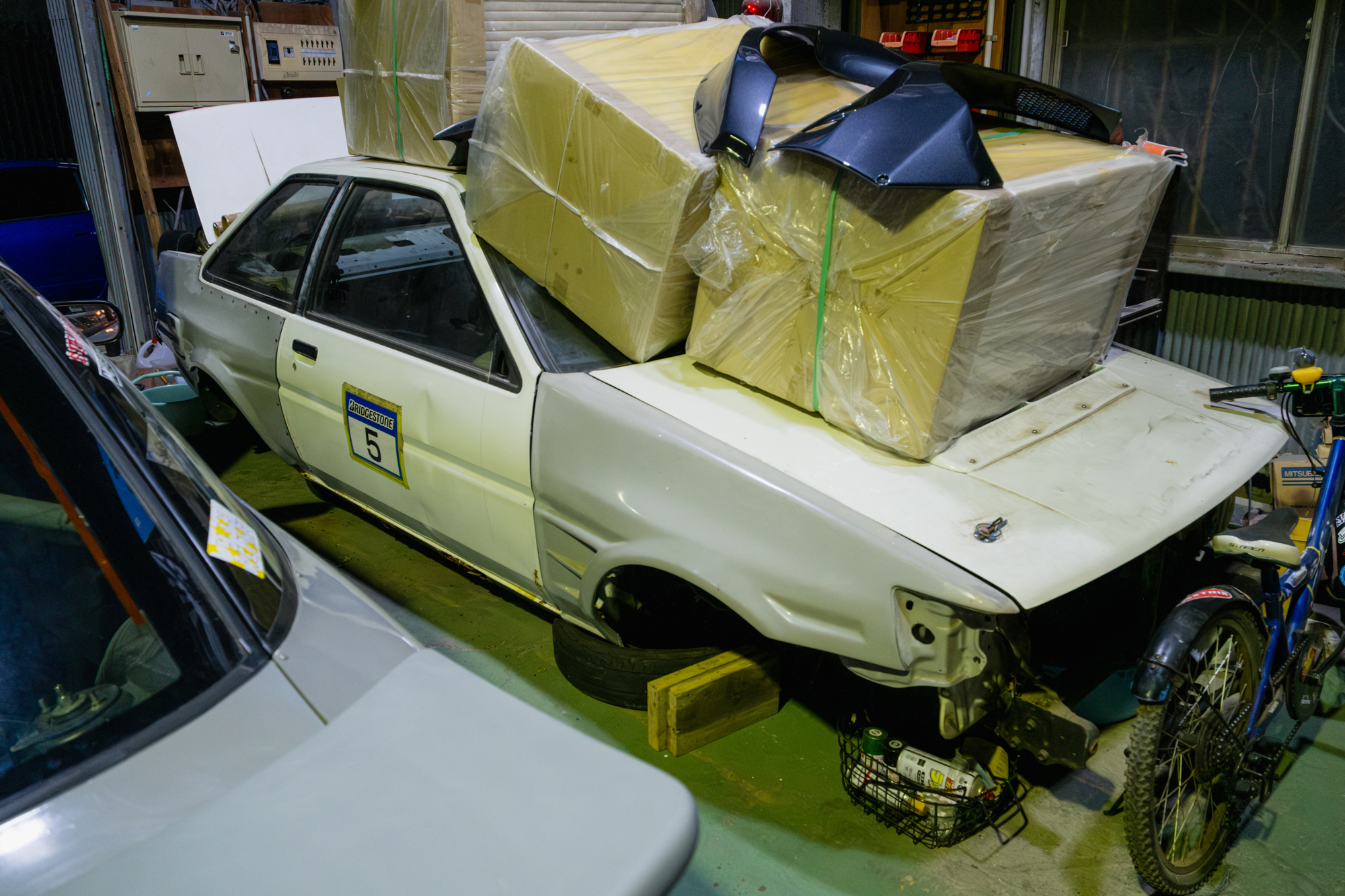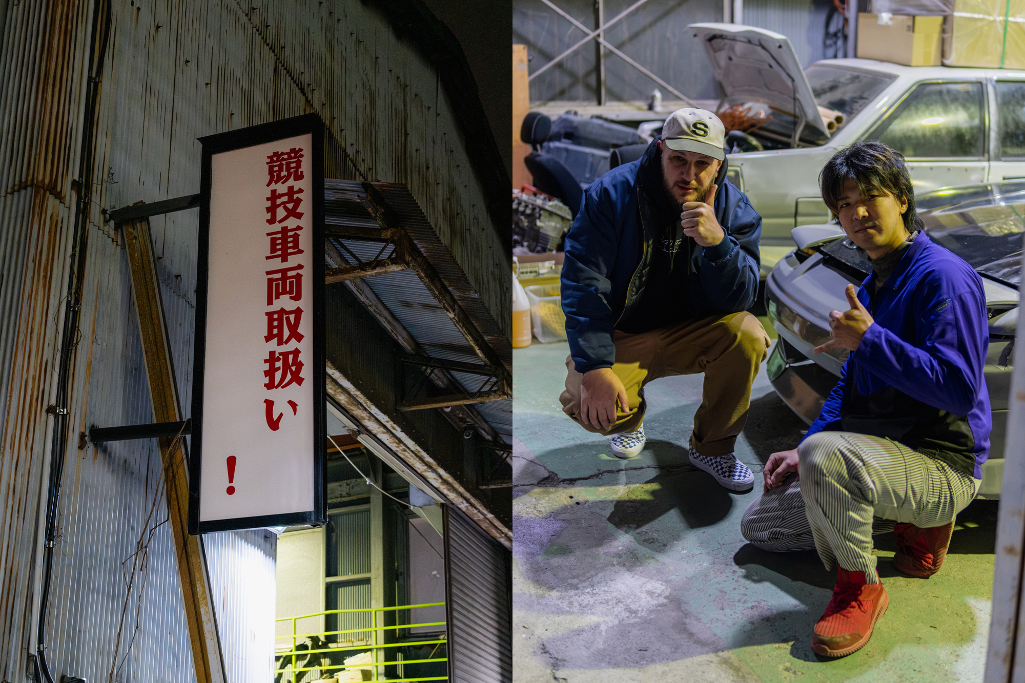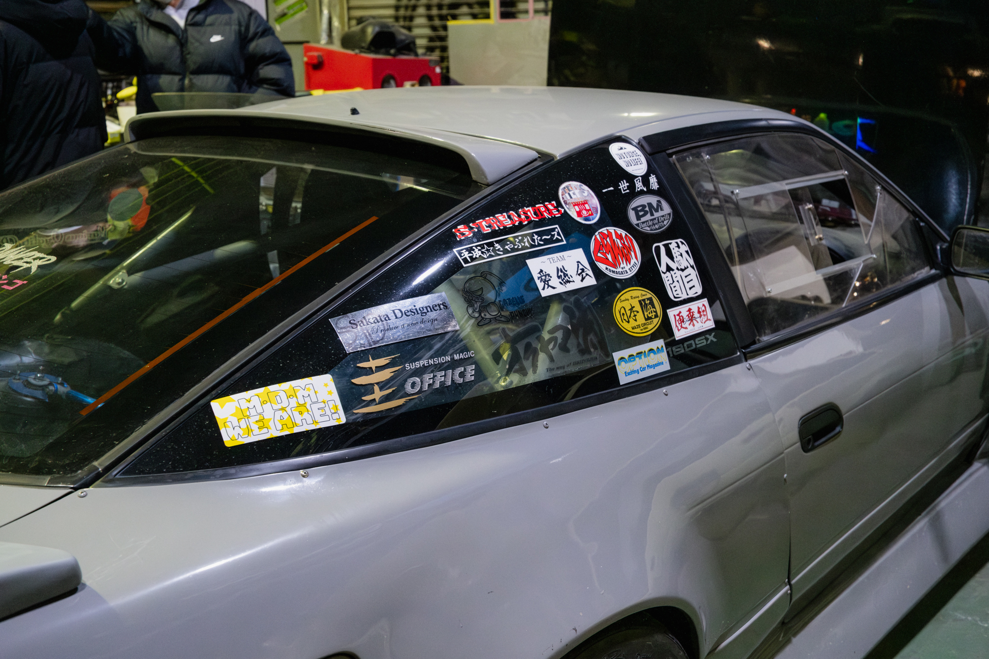 At the end of the laneway, we arrive at the workshop. It’s called “Various Quality R’s,” and it’s run by a guy named Rikiya, a well-known drifter in Tokyo. He’s best known for his green AE86, powered by a naturally aspirated rotary engine, though that car wasn’t at the shop that night. Instead, his grey 180SX was parked inside.