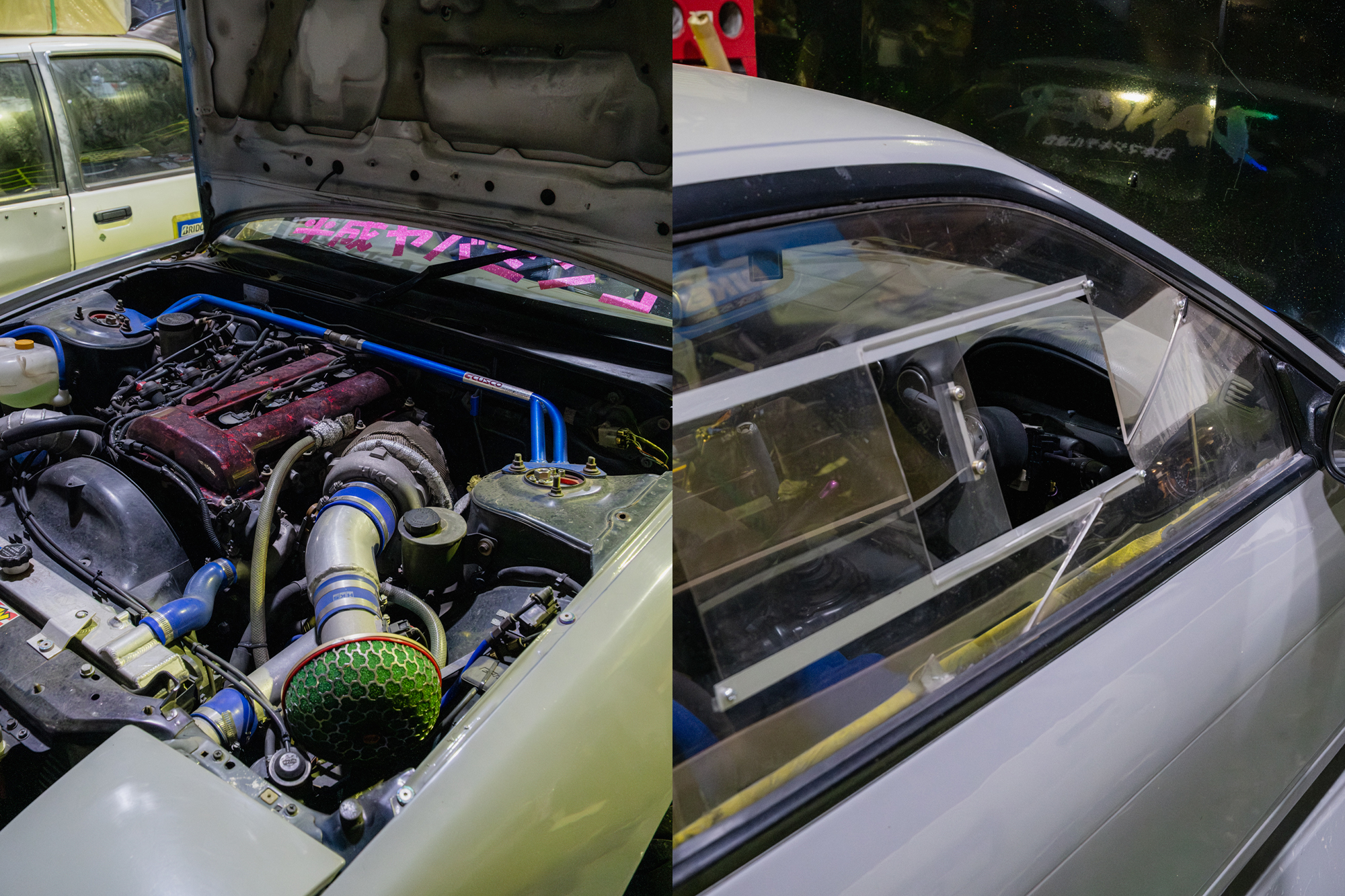 This is Rikiya’s 180SX, a machine purpose-built for the street. When I asked if he ever takes it to the circuit, he simply replied, “Not really, if I do, its only to practice for the street.” It’s SR-powered, which I love to see, especially considering most S-chassis cars in Australia have had their SRs pulled out in favour of JZs, RBs, or LS swaps. It’s running an HKS turbo, FRP doors, and polycarbonate windows, pretty insane for a street car. The AE86 sitting next to it is there as backup, ready to donate its running gear if anything ever happens to the 180SX.