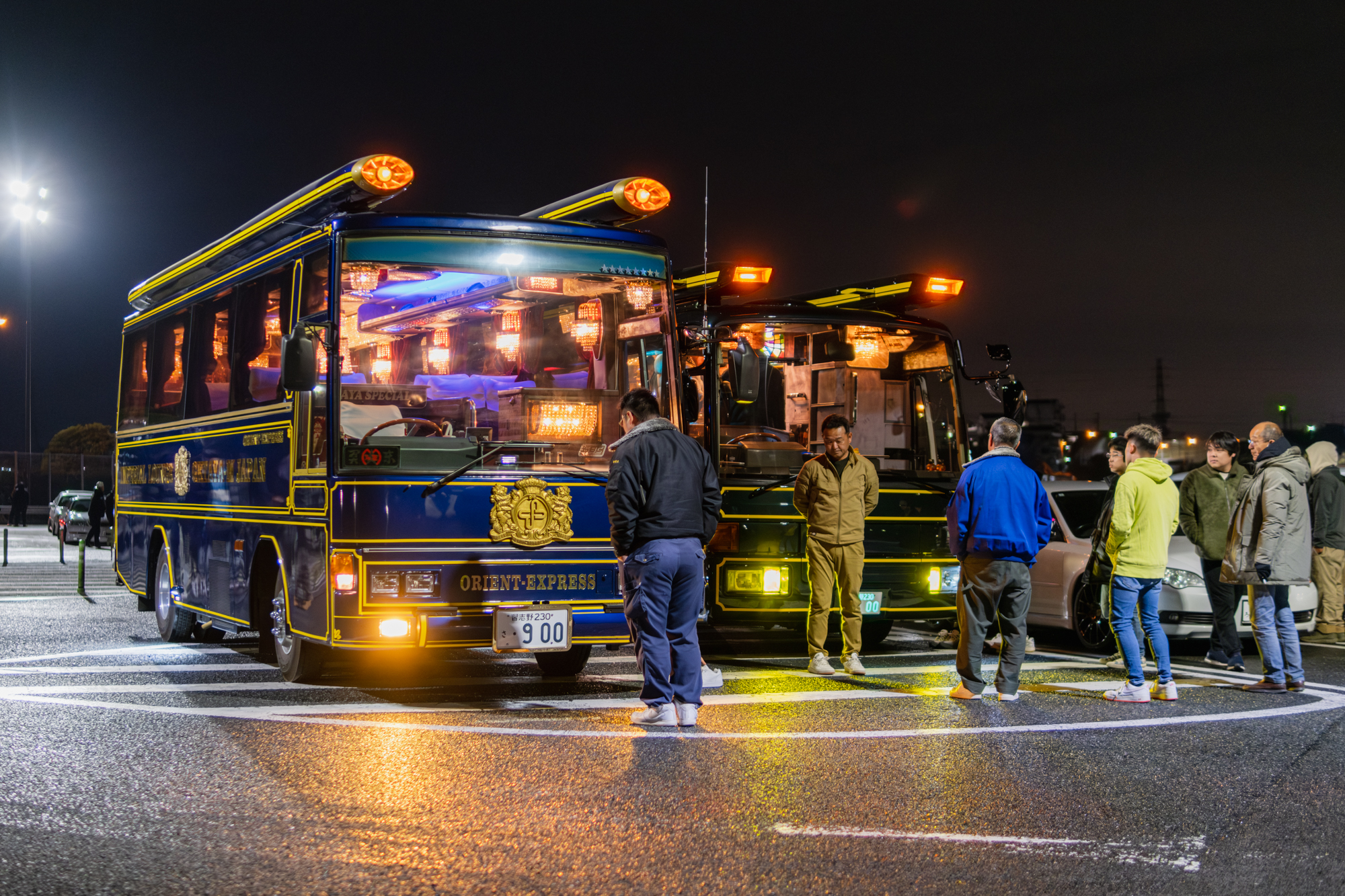 We were also lucky enough to have two old-school Japanese VIP salon buses pull up, completely decked out with chandeliers and lights, kind of like Dekotora, but for buses. The owner was kind enough to give us a full tour inside, and with plush carpet, velour seats, and heaters pumping, stepping out of the cold into that warmth was honestly the best feeling, haha.