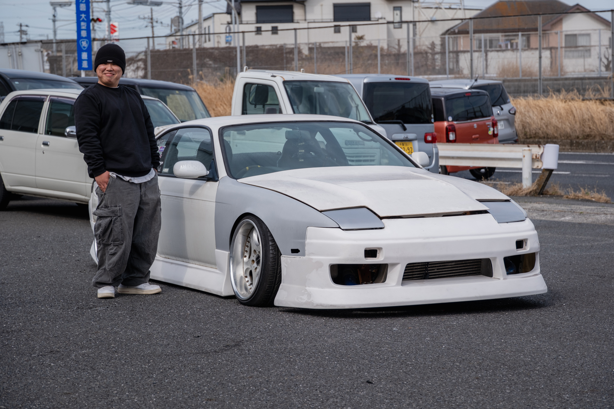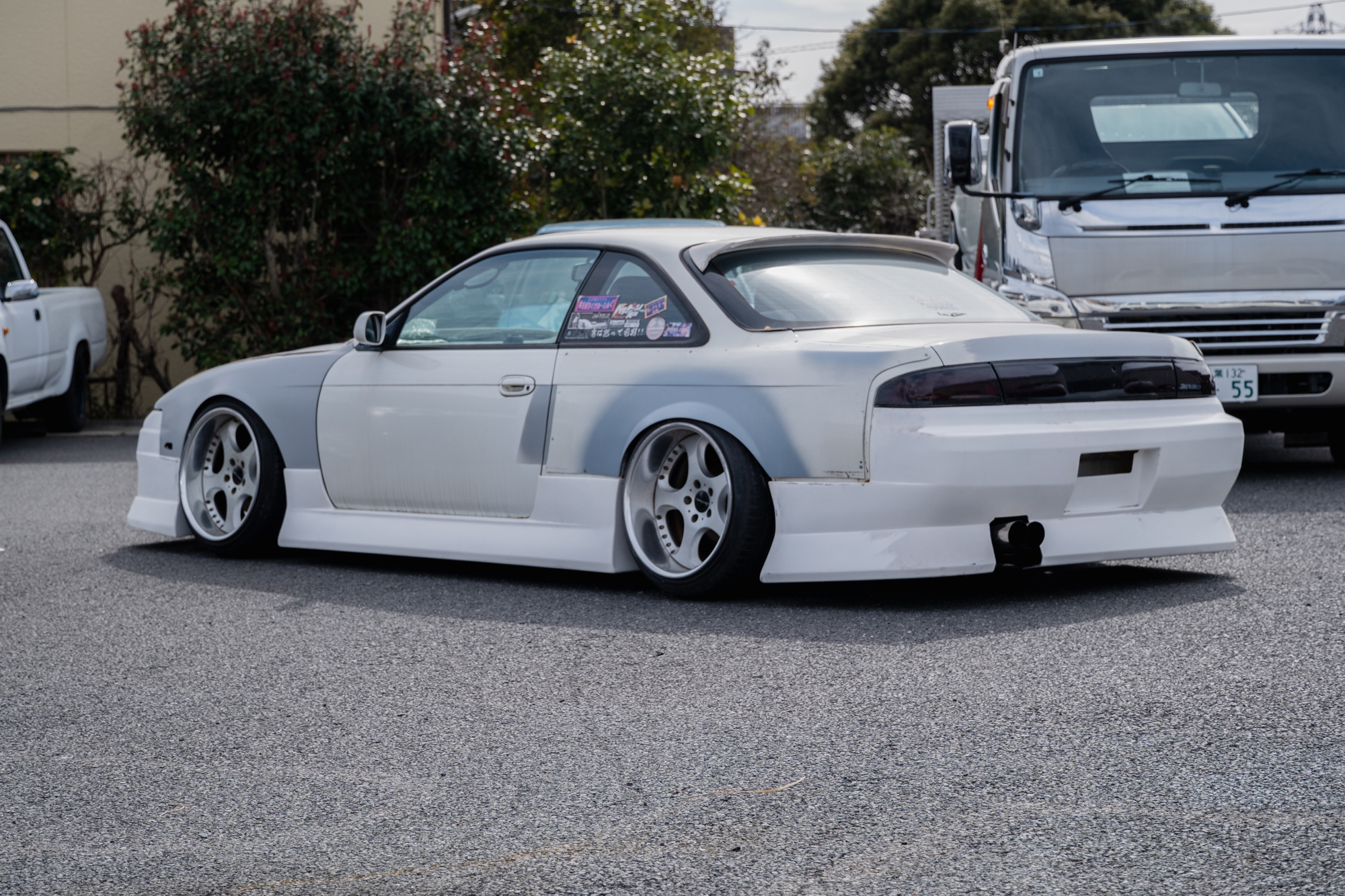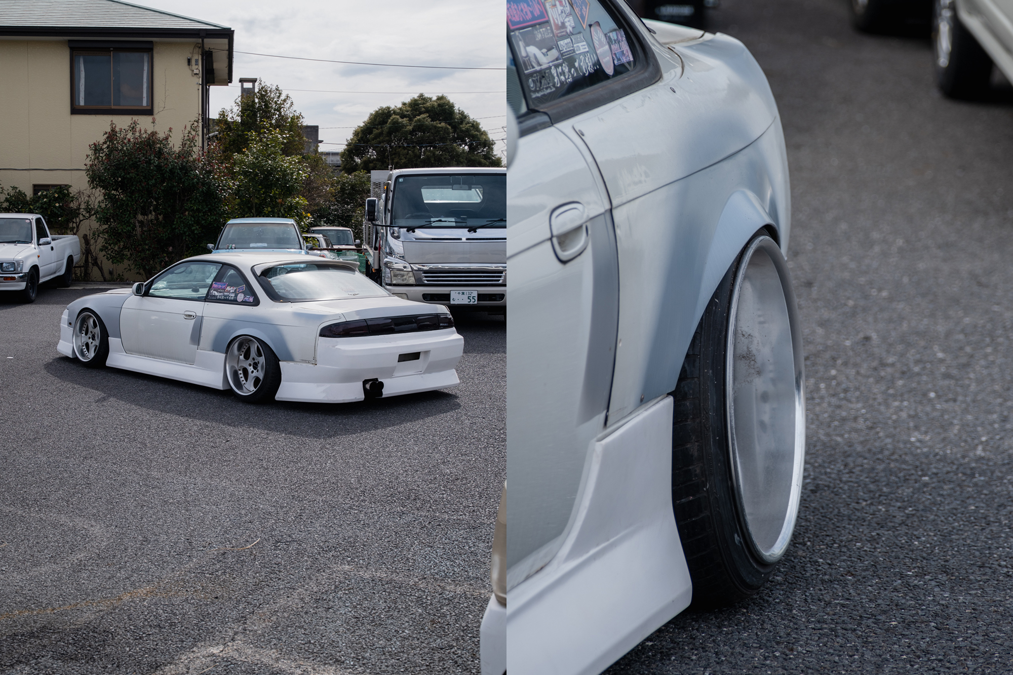 During my recent trip to Japan, I really wanted to shoot Kaeda’s S14 Silvia. He’s converted it to a 180SX front by cutting and modifying a set of steel front fenders. The car is still a work in progress and currently sitting at his panel shop in Chiba, but I wanted to shoot it before it was completed.