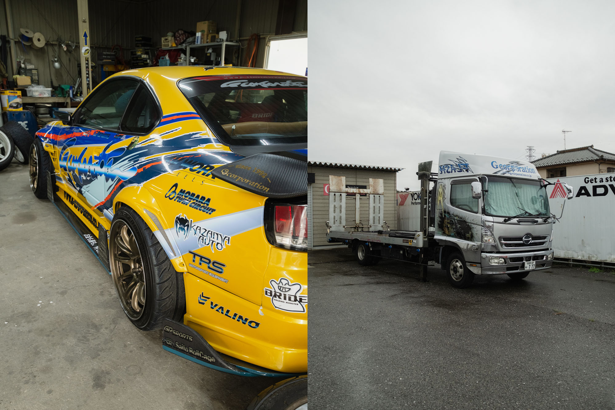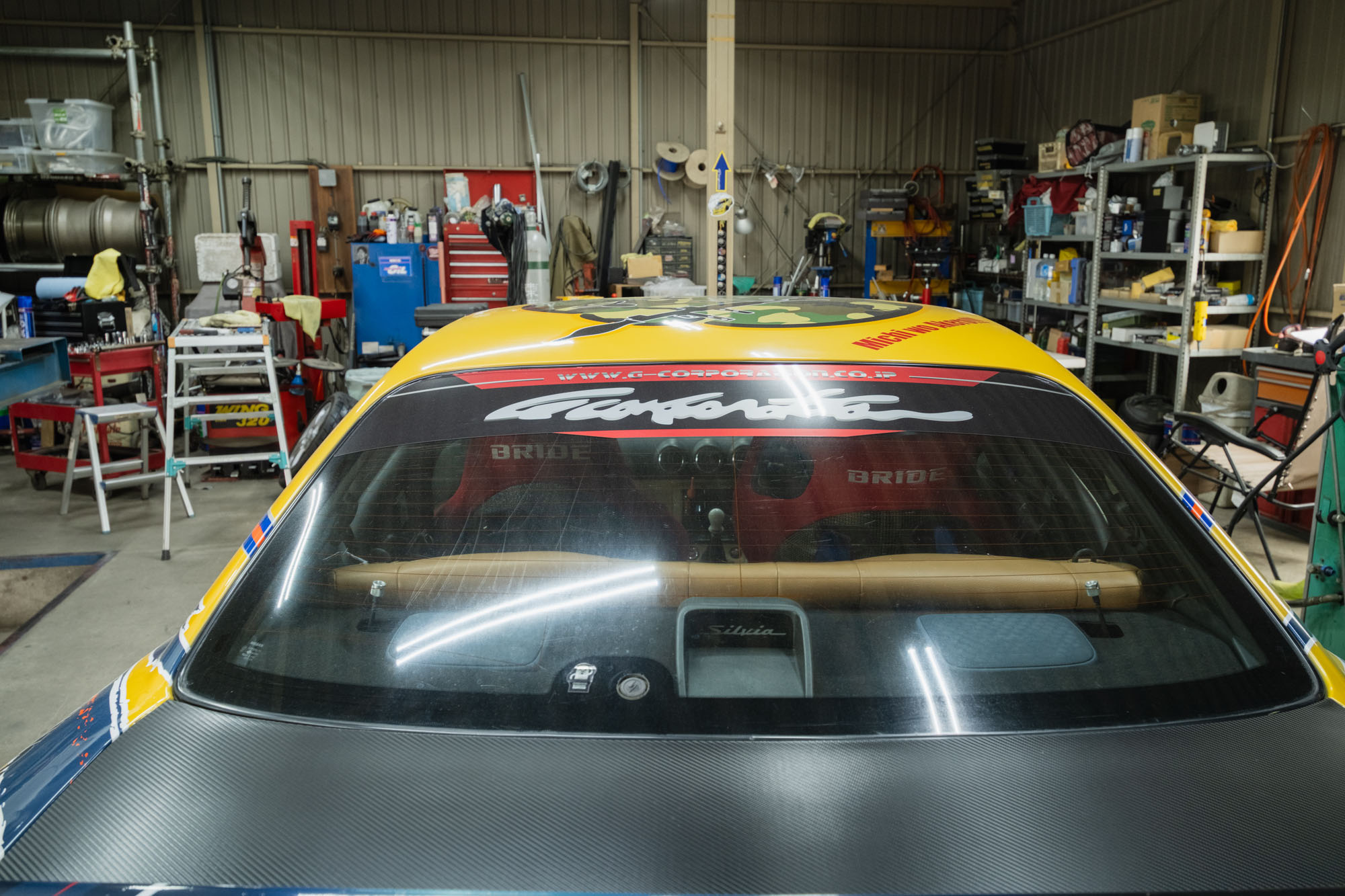 I was lucky enough to be given a tour of Nakamura-san’s S15 Silvia drift car, which is a masterpiece in its own right. Nearly every part has been customised by Nakamura-san himself. The aero is the original G-Corporation Flash Type 2, an evolution of the earlier Type 1, which lacked the side vents. You can see the lineage clearly when compared to the Flash Type 2 aero on the 180SX, itself loosely inspired by the original Nissan 180SX Type X bumper. The fenders, wing, canards, and mirrors are all original G-Corporation parts.