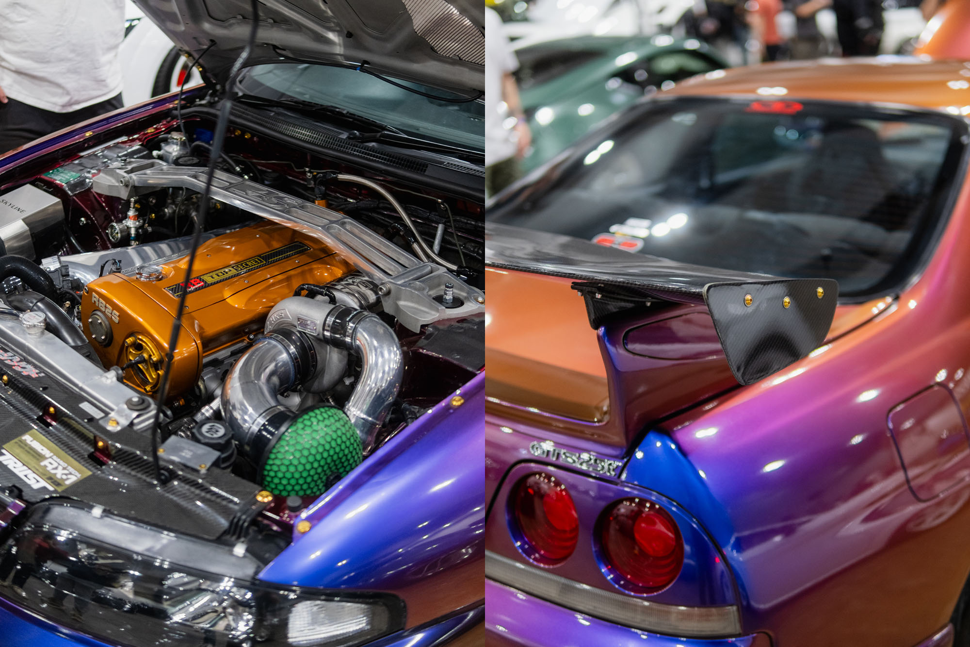 Some other standout cars for me were Logan’s Toyota Echo, converted to RWD and powered by a 7AG with ITBs, sitting on CST Demon Camber wheels, and Joel’s R33 GTS-T Skyline, which captured true 2000s style with what’s suspected to be Maziora color-flip paint, Volk GT-S wheels, an RB25 with an HKS T04Z, and parts from Top Secret, Auto Select, and Bee R.